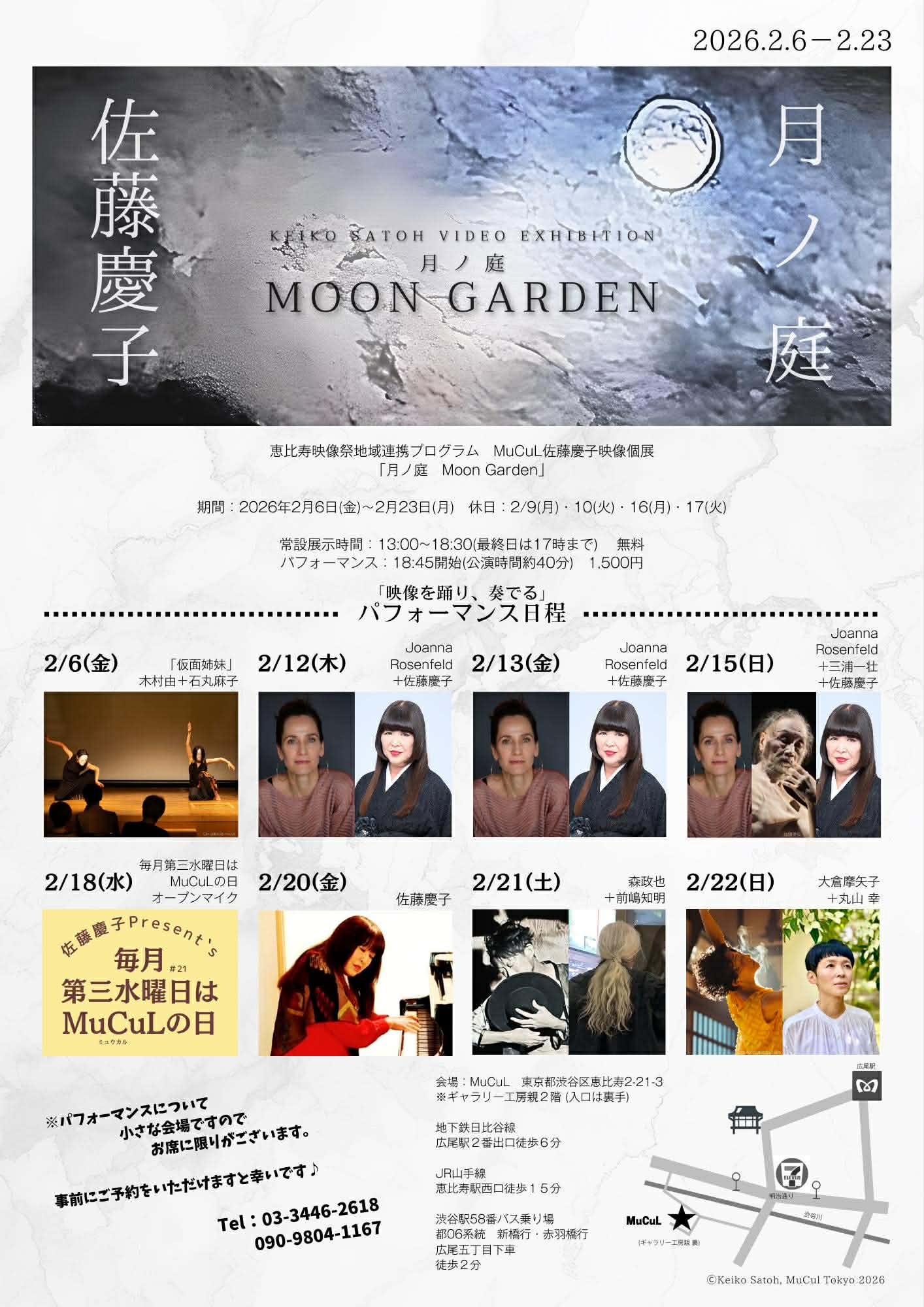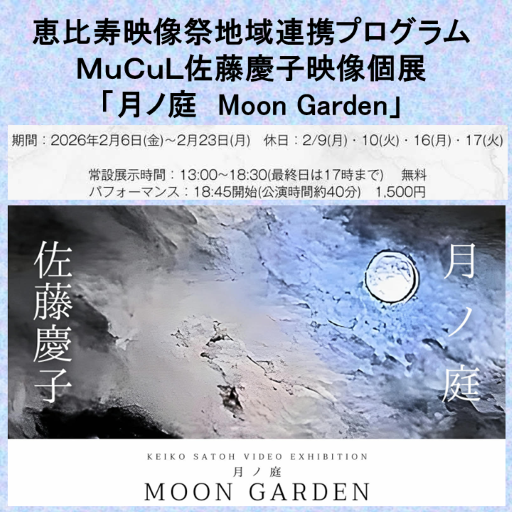 賛助会員 MuCuL代表佐藤慶子さんの映像個展2/6-2/23をご案内します。 賛助会員のMuCuL代表 佐藤慶子による東京都等が主催する「恵比寿映像祭連携プログラム・MuCuL佐藤慶子 」の映像個展をご案内いたします。 会場は東京都渋谷区恵比寿2-21-3 MuCuLです。会期は2月6日から23日午後ですが、一部休日があります。映像展示は入場無料ですが、18時45分からのパフォーマンスは1,500円になります。詳細は下記リーフレットをご参照ください。 リーフレットのダウンロード